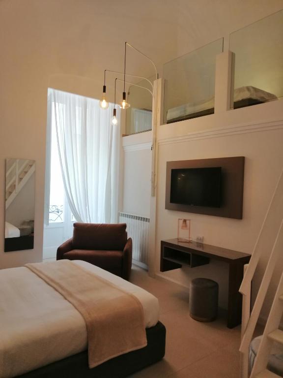 No andar de cima, os quartos variam desde os compactos «Pretty Rooms», com varandas, até aos mais amplos «Charming Rooms», com camas king size e terraços, um dos quais com piscina privada. As suites de estilo arrojado oferecem toques de design únicos, enquanto as opções de gama superior incluem casas de banho luxuosas com banheiras e chuveiros espaçosos. A sua localização central coloca-o a uma curta distância a pé da cidade velha e do porto de Bari.