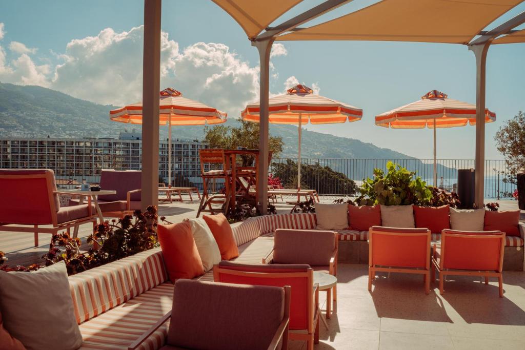 Situado acima do animado porto do Funchal, o terraço é o ponto alto, com espreguiçadeiras, vegetação e uma piscina infinita de água salgada. Os hóspedes podem relaxar entre jogos de pingue-pongue enquanto saboreiam pratos como tacos e hambúrgueres Wagyu.